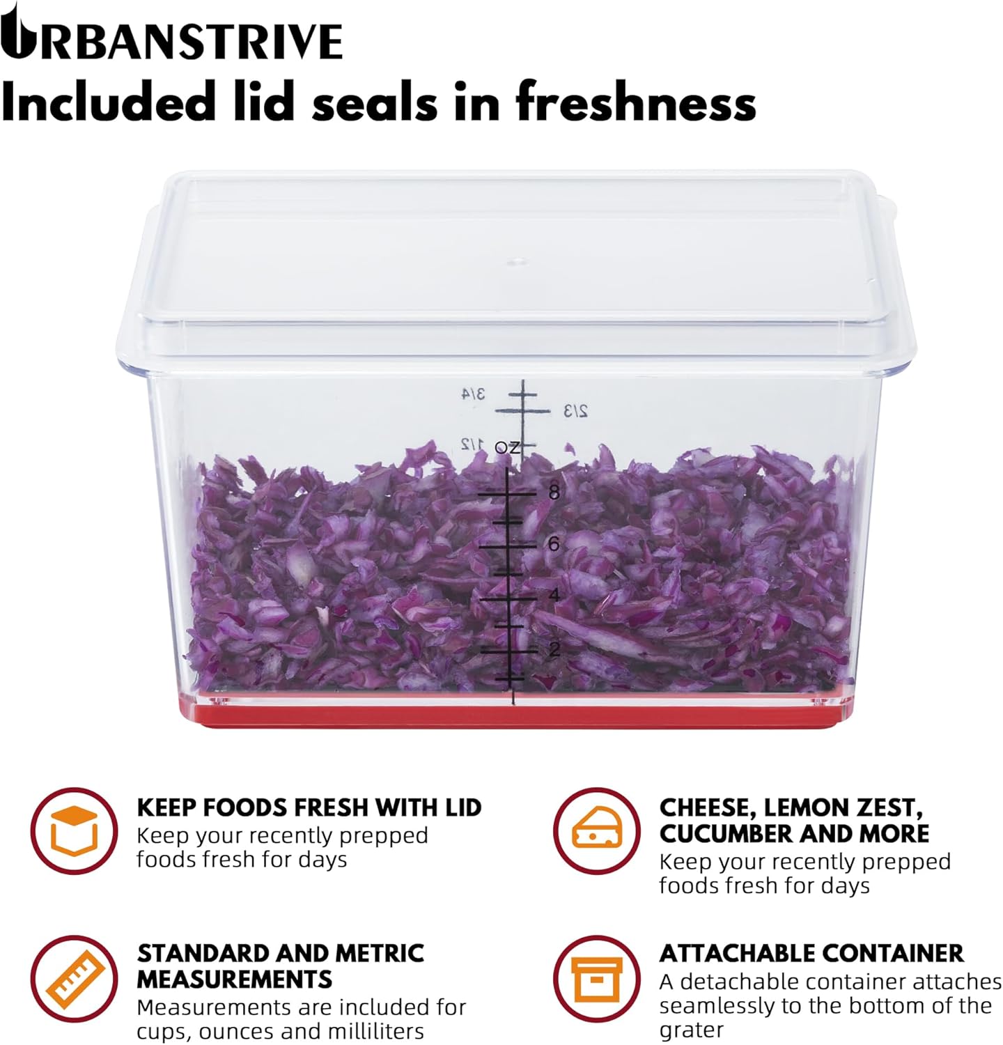 • Non-slip Base & Detachable Container - Black TPE material (5%) on the base helps keep the grater securely in place while in use. Attachable container for catching, measuring, and storing freshly grated foods