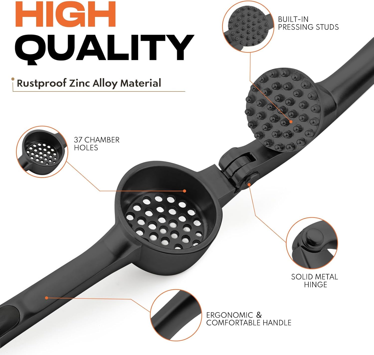 Kitchen Garlic Press, Rust Proof & Dishwasher Safe Garlic Mincer, Durable Garlic Crusher Set with Peeler&Brush, Easy to Clean and Squeeze, Black
