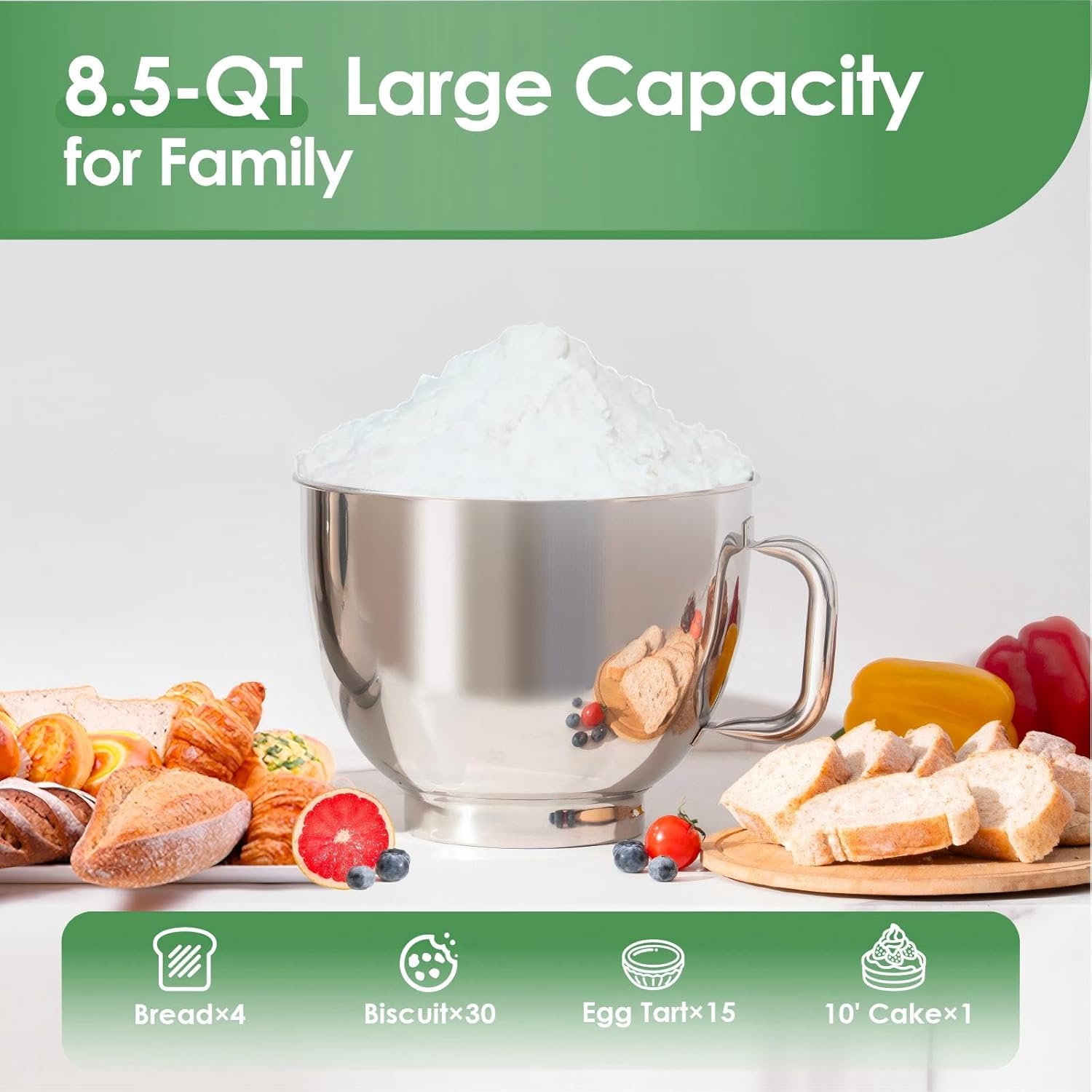 • 8.5 Quart Giant Capacity: Our stand mixer comes with an 8.5 QT stainless steel bowl, providing ample space for preparing large batches of dough, batter, or mixtures. It's ideal for family meals, gatherings, and large-scale baking projects. The convenient single-handle design allows for easy lifting and pouring with hands.