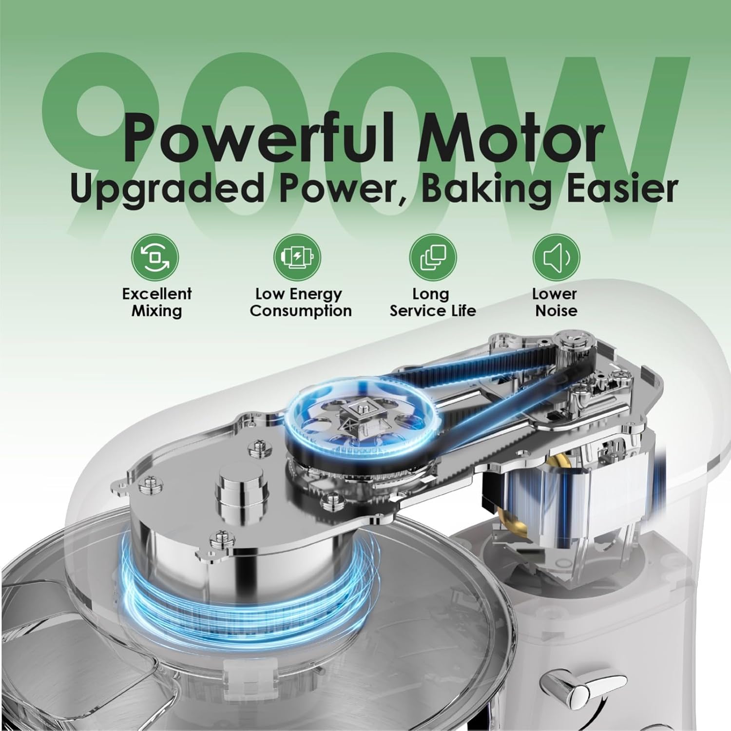 • 900W Powerful Motor for Kneading Heavy Dough: Equipped with a 900W pure copper motor, this mixer delivers robust power with smooth and efficient performance.The high-powered motor effortlessly handles heavy dough and thick mixtures while also providing precision whipping for delicate textures and consistent blending. Whether for daily use or complex baking needs, it delivers ideal results.