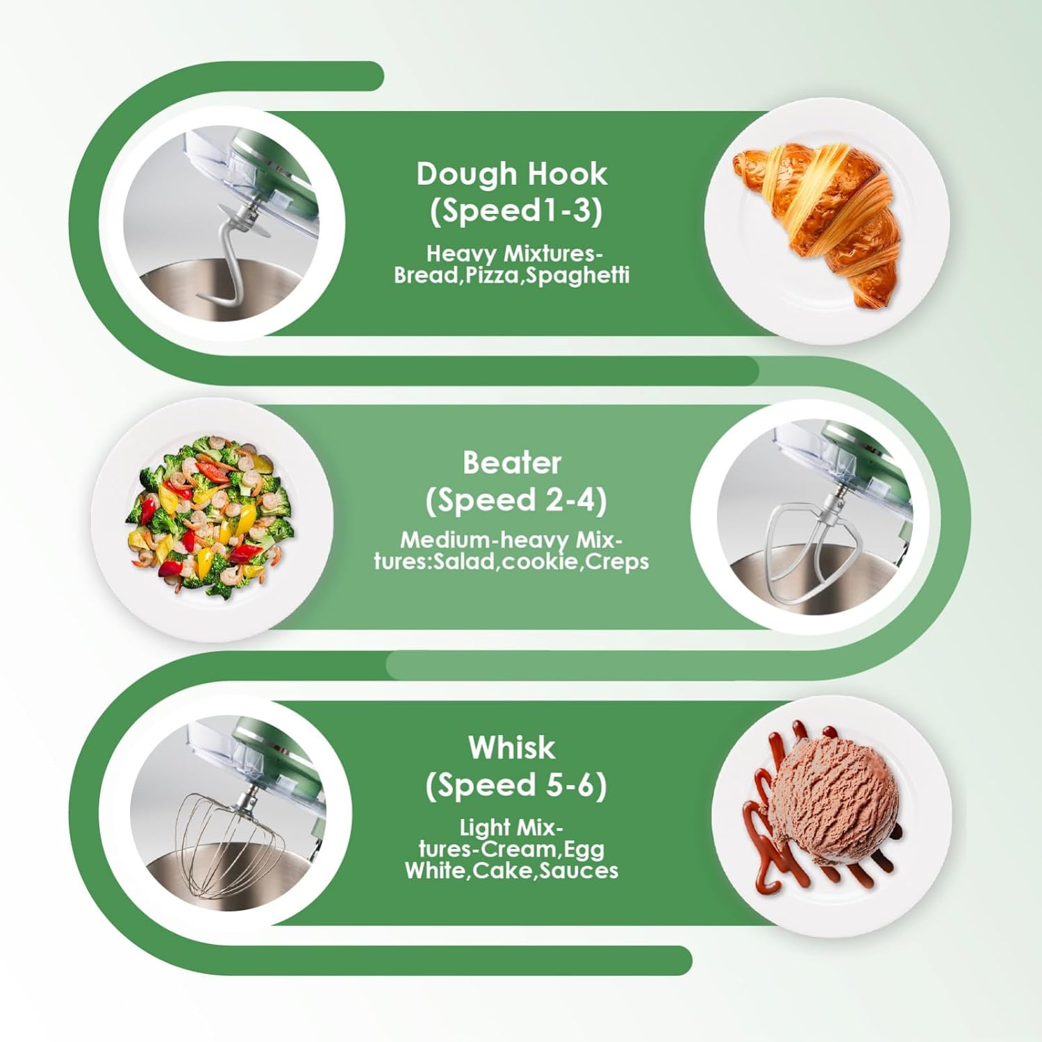 • 6 Speed, Easy to Use: This kitchen mixer features six adjustable speed settings and easy operation to meet your diverse mixing needs. The tilt-head feature allows for effortless switching between bowls and attachments.Its intuitive design ensures ease of use, making it ideal for both beginners and experienced bakers, delivering reliable performance for baking tasks.