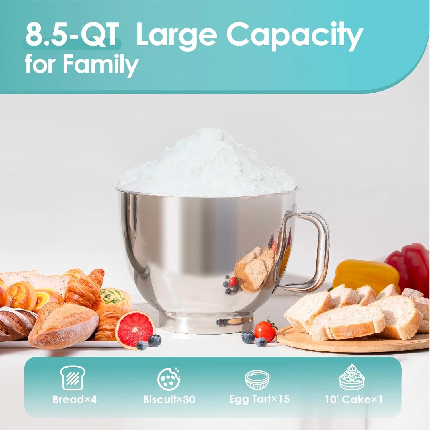 • 8.5 QT High Capacity: Our stand mixer comes with an 8.5 QT stainless steel bowl, providing ample space for preparing large batches of dough, batter, or mixtures. It's ideal for family meals, gatherings, and large-scale baking projects. The convenient single-handle design allows for easy lifting and pouring with hands.