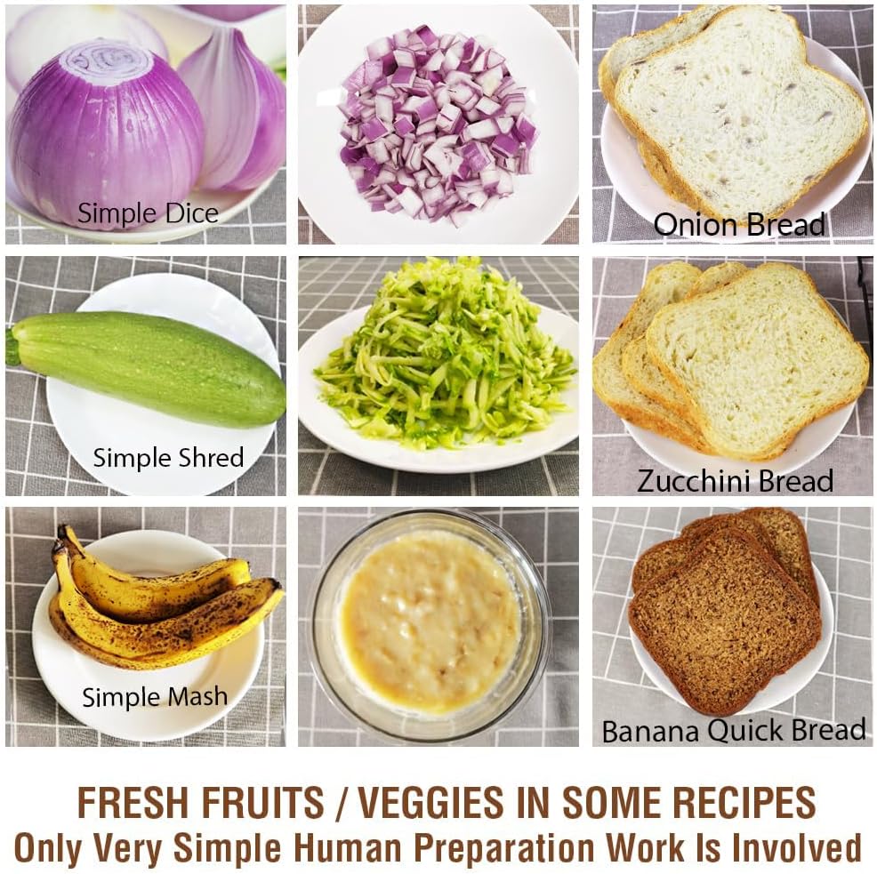 • FRESH VEGETABLES & FULLY PROGRAMMABLE - For better flavors and nutrition, we often use fresh vegetables and fruits in our recipes. - KitchenArm recipes are specially designed to handle fresh onions, oranges, potatoes, zucchini, overripe bananas, etc. in the most efficient way. - The fully programmable HOME MADE menu (Menu #19) allows you to specify each bread-making cycle time (KNEAD, REST, RISE, BAKE..) to adapt the machine to your own recipes or explore the endless bread making possibilities.