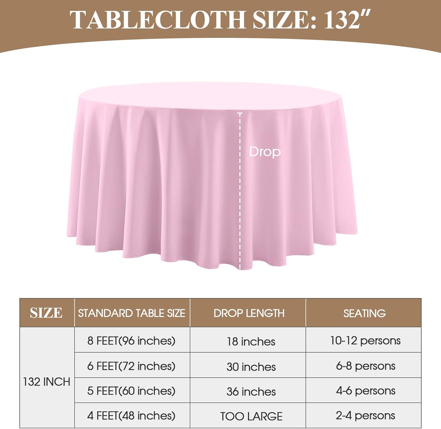 • Suitable Size: This polyester round tablecloth has multiple sizes to choose from, 90, 108, 120, 132 inches, which can meet the needs of tables of different sizes. In order to buy a tablecloth that is more suitable for your table, please measure the actual size of your table before purchasing and refer to our size chart