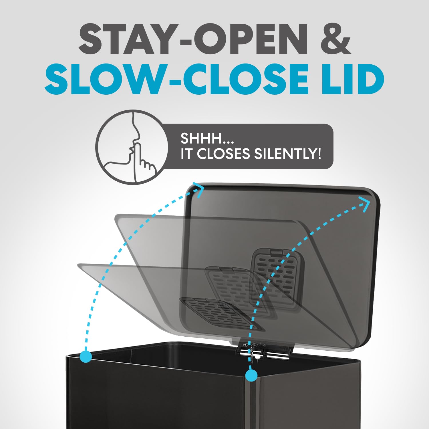 • Quiet-Close Lid: Lid closes quietly and gently without slamming. Hands Free and Fingerprint Proof: Hands-free operation with durable a metal foot pedal and fingerprint-resistant stainless steel finish leads to your trash can staying cleaner longer
