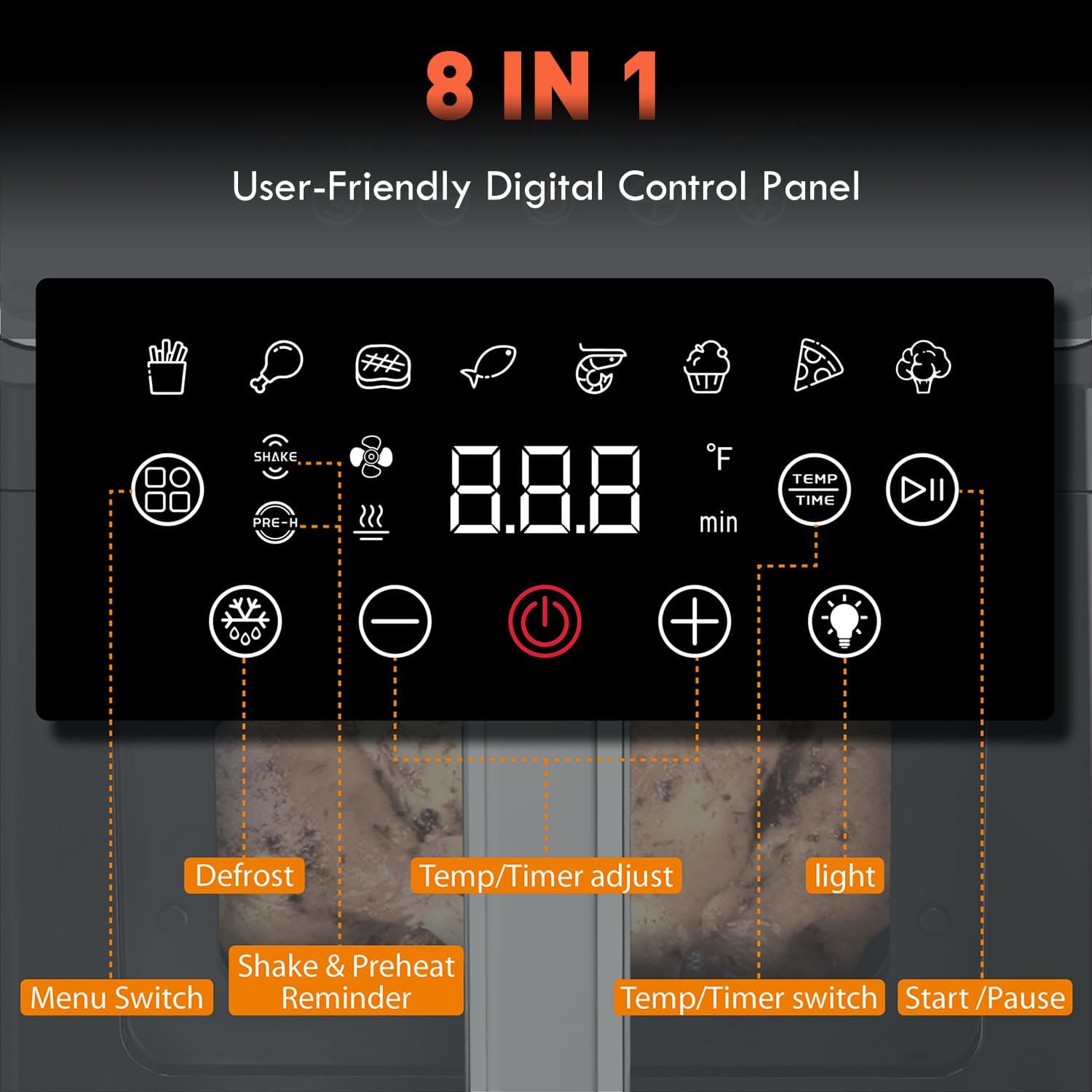 • 8-in-1 Versatility with Intuitive 45° Touch Panel: Enjoy 8 versatile cooking presets for all your favorite dishes. The 45° ergonomic touch panel ensures sensitive and precise control, while the advanced temperature system guarantees perfect results every time (160℉ to 450℉), enhancing the flavor and texture of your meals.