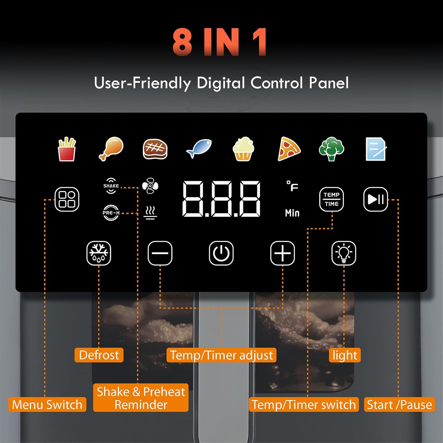 • 8-in-1 Versatility & Color Touchscreen for Effortless Cooking:Enjoy 8 versatile cooking presets for all your favorite dishes. The intuitive color touchscreen is responsive, easy to clean, and ensures precise temperature control (160℉ to 400℉), delivering perfectly cooked meals with enhanced flavor and texture every time.