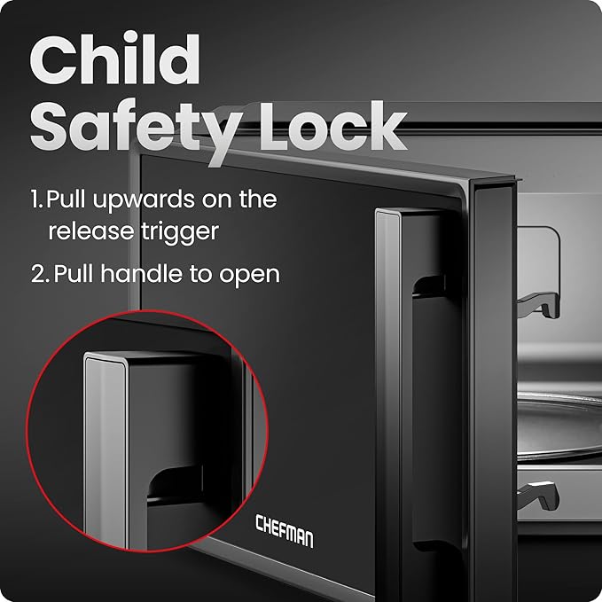 • SAFETY FIRST: The built-in child safety lock on the handle ensures the door doesn’t open accidentally, and you can disable the microwave control panel using the Lock Mode.