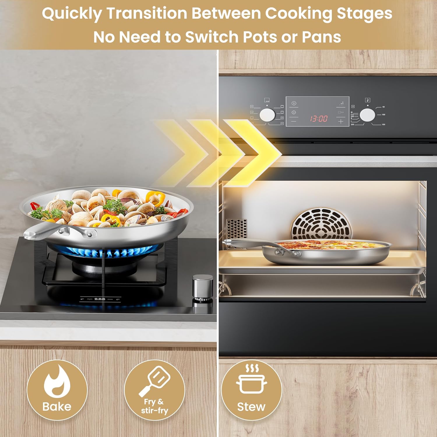 • 【Compatible with All Cooktops & Oven Safe】: This stainless steel frying pan with lid is safe for induction, gas, electric, ceramic, and halogen cooktops. Oven safe up to 500°F and dishwasher friendly—seamlessly transitions from stovetop to oven to table.