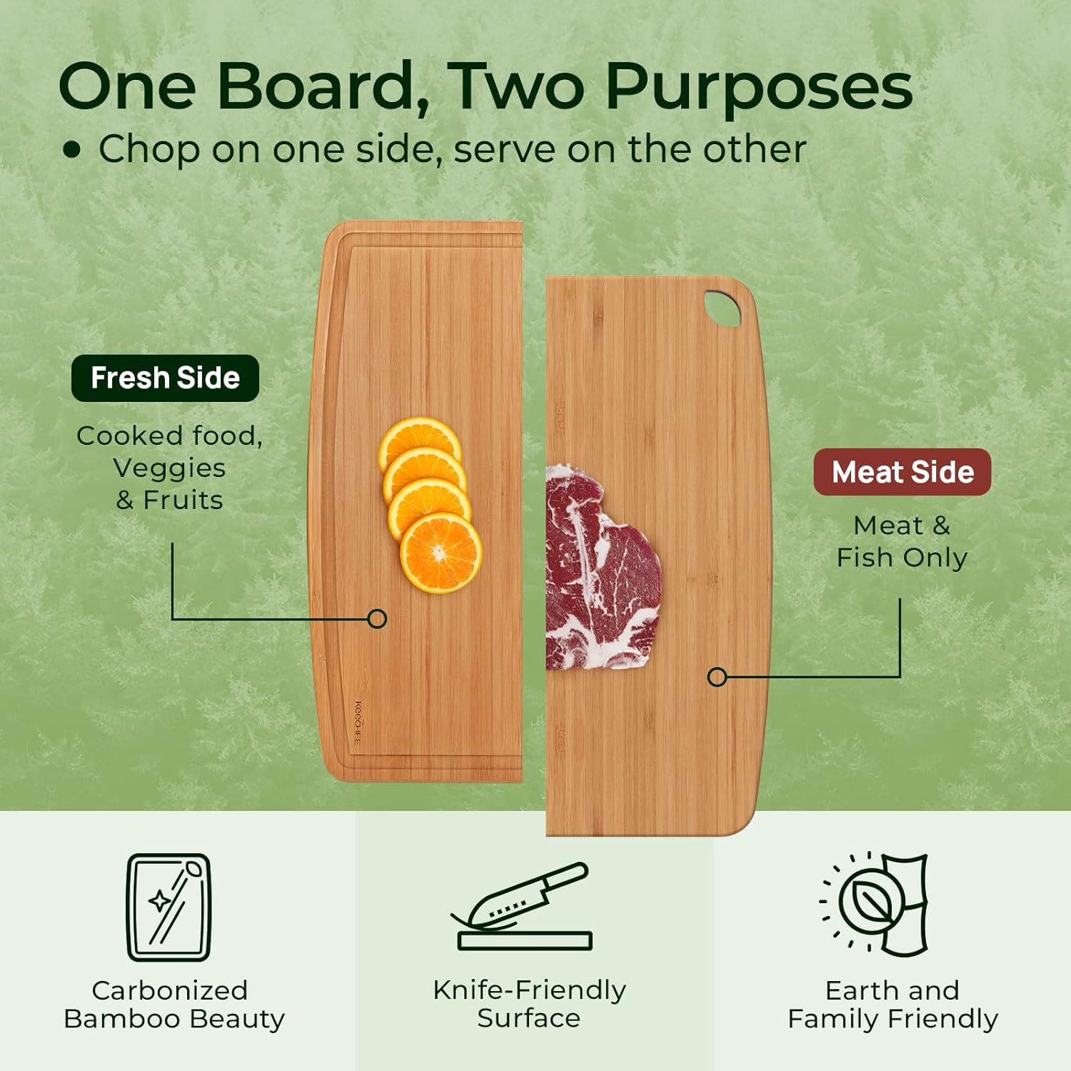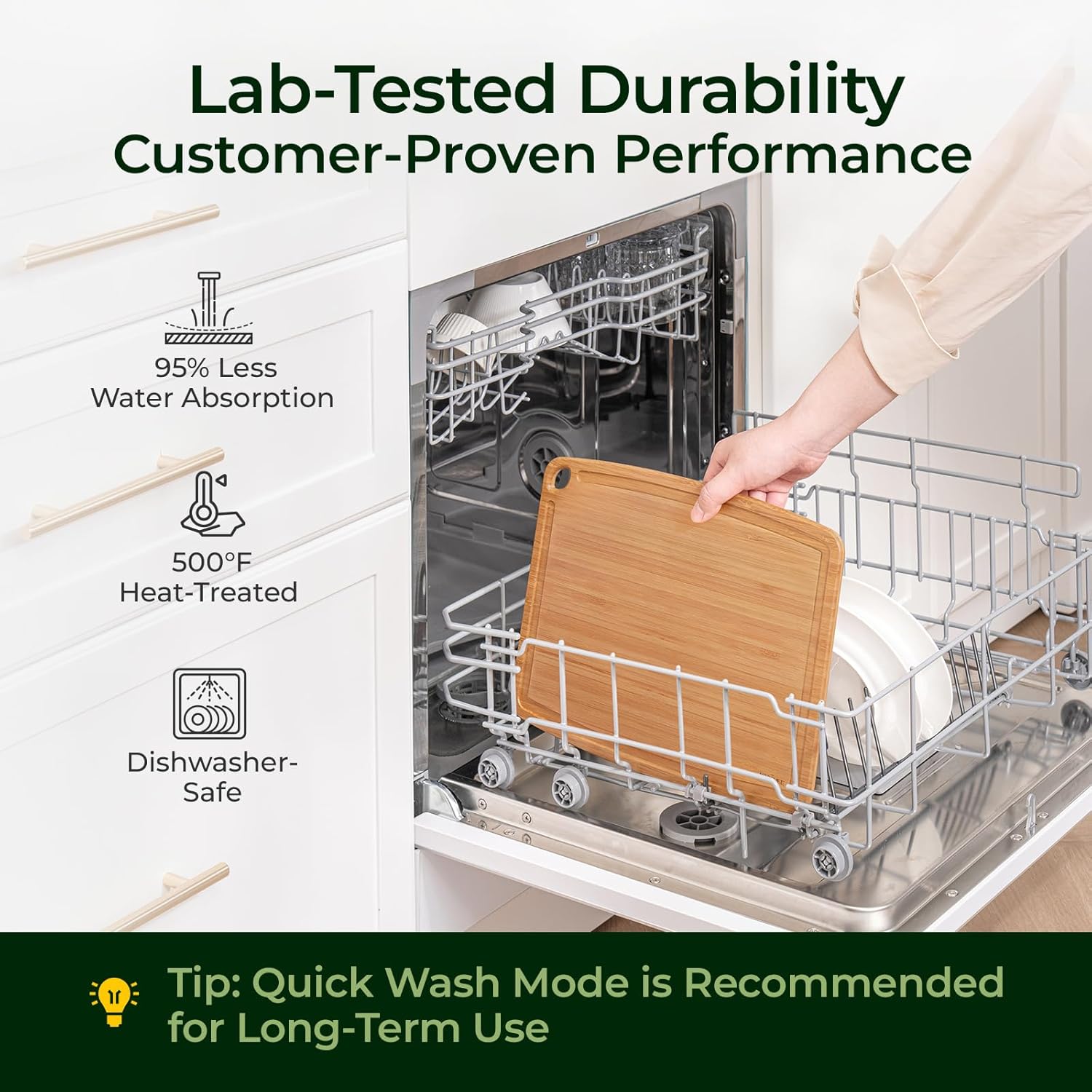 • DISHWASHER-SAFE BAMBOO, FINALLY REAL: Specially engineered bamboo cutting board that withstands heat and water without warping or cracking — created for effortless cleaning and a stress-free cooking routine.