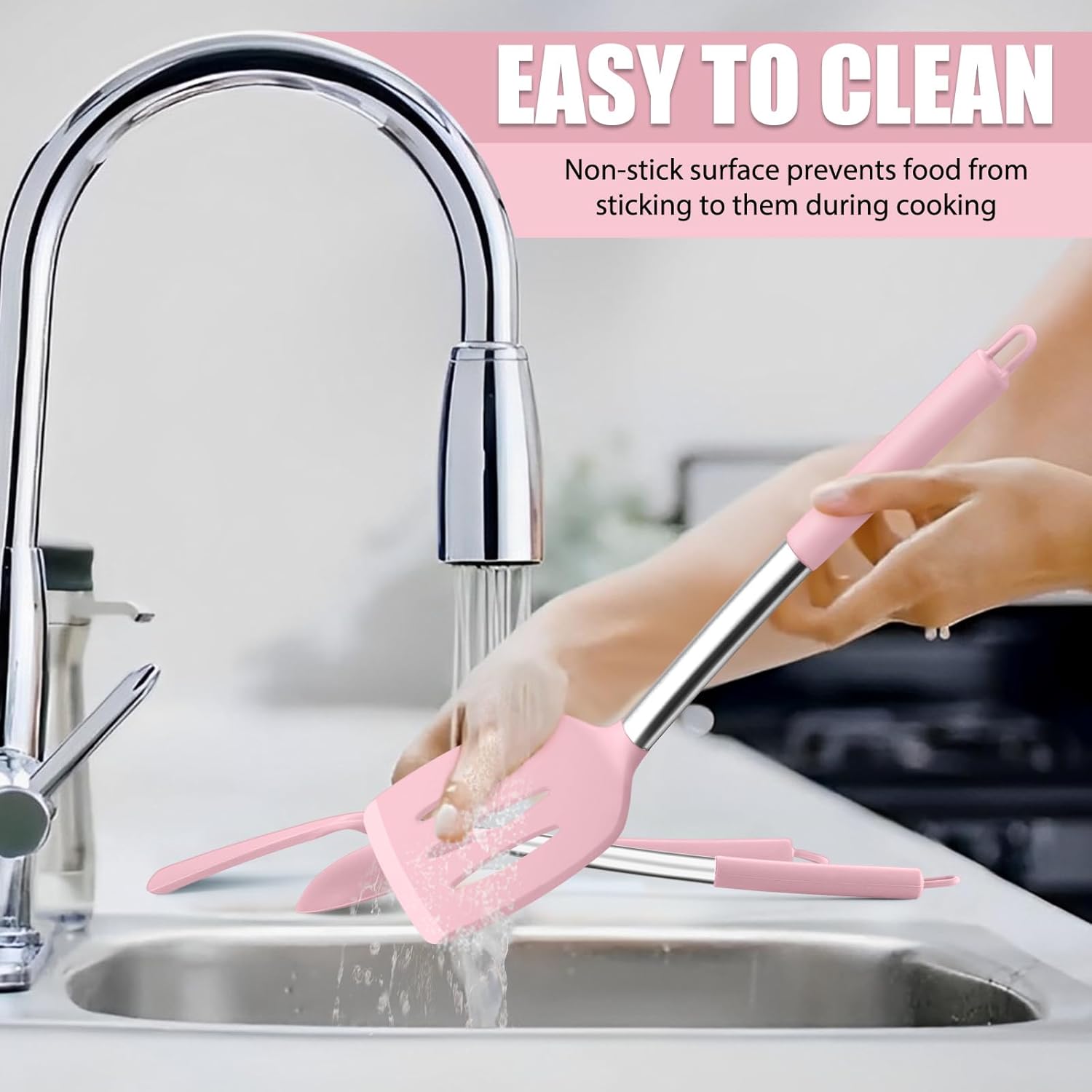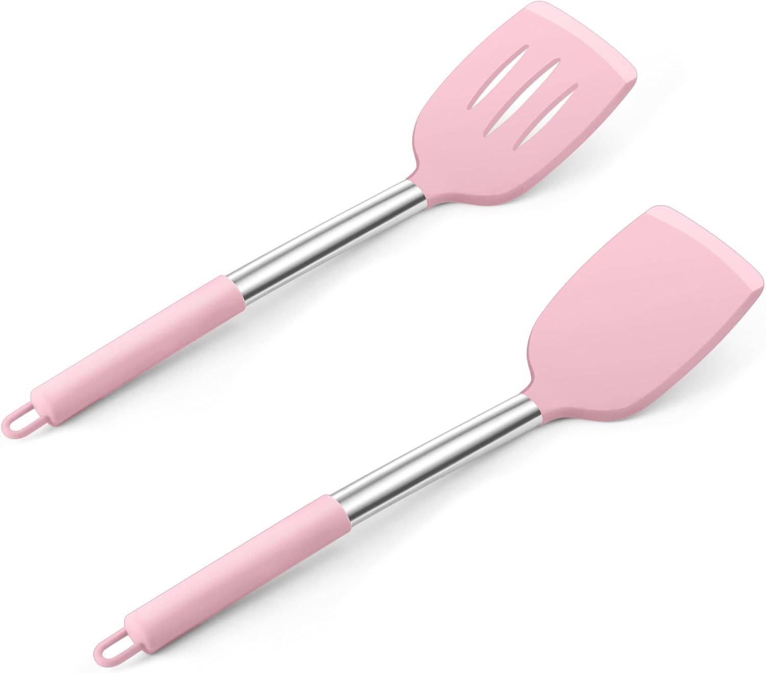 E-far Silicone Spatula Set of 2, Solid & Slotted Turner for Nonstick Cookware, Heat Resistant Rubber Kitchen Cooking Utensils for Flipping Fish Pancake Egg - Pink