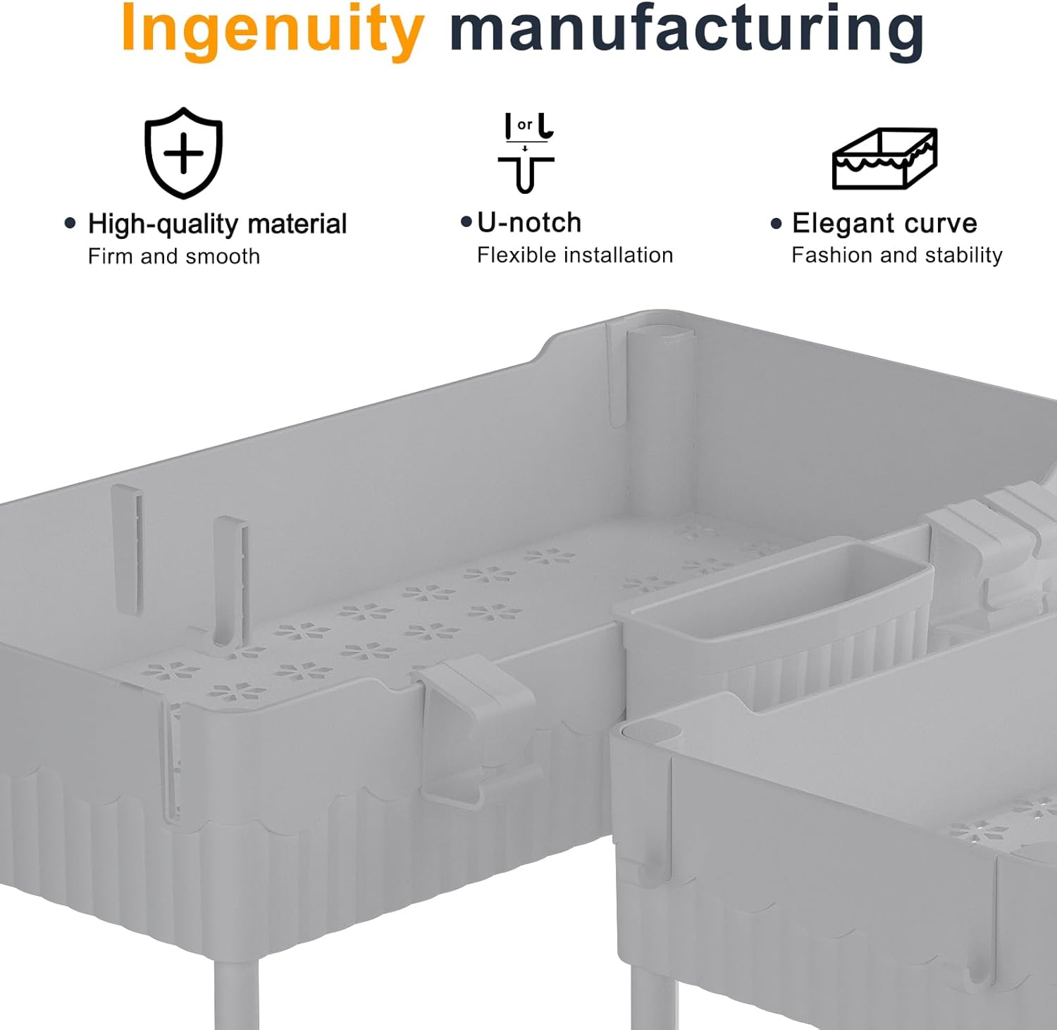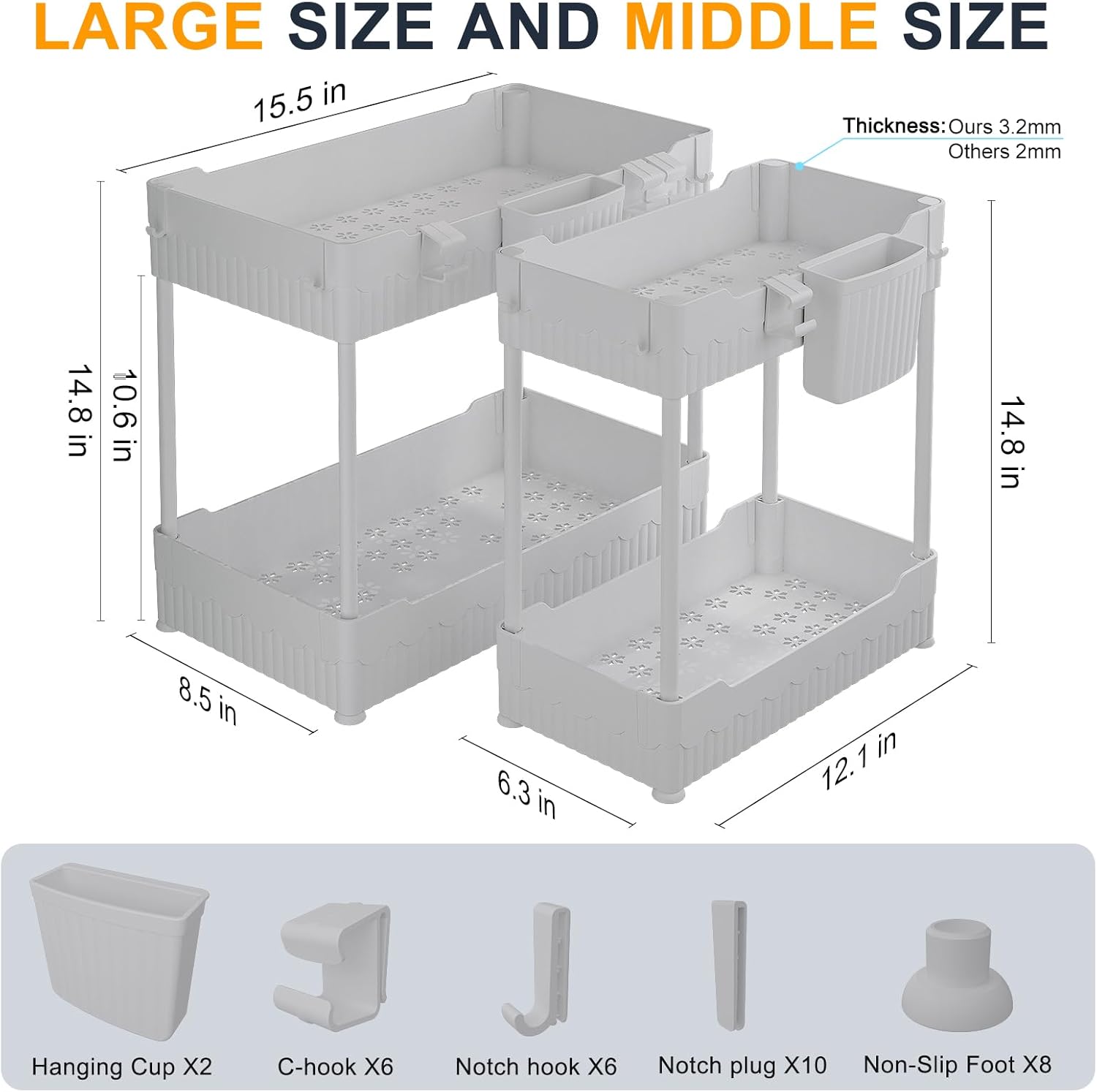 2 Pack Under Sink Organizer, Under Bathroom Cabinet Organizer with Hooks Hanging Cup, Multi-Purpose Storage Shelf for Kitchen Bathroom (Gray, XL)