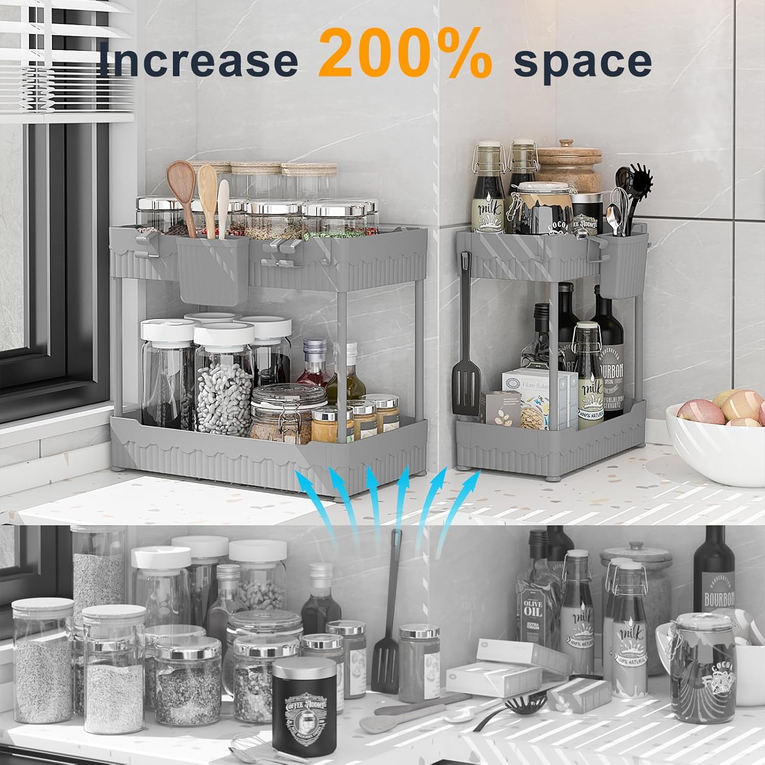 2 Pack Under Sink Organizer, Under Bathroom Cabinet Organizer with Hooks Hanging Cup, Multi-Purpose Storage Shelf for Kitchen Bathroom (Gray, L)