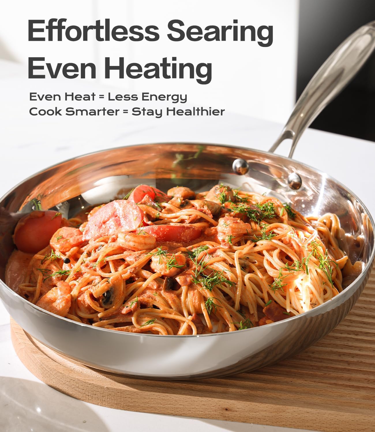 12 Inch Stainless Steel Frying Pan with Lid, 3-Ply Stainless Clad Skillets Fry Pan Fast & Even Heating, Oven Safe Up to 600℉ Dishwash Safe Compatible for All Cooktops Kitchen Cookware