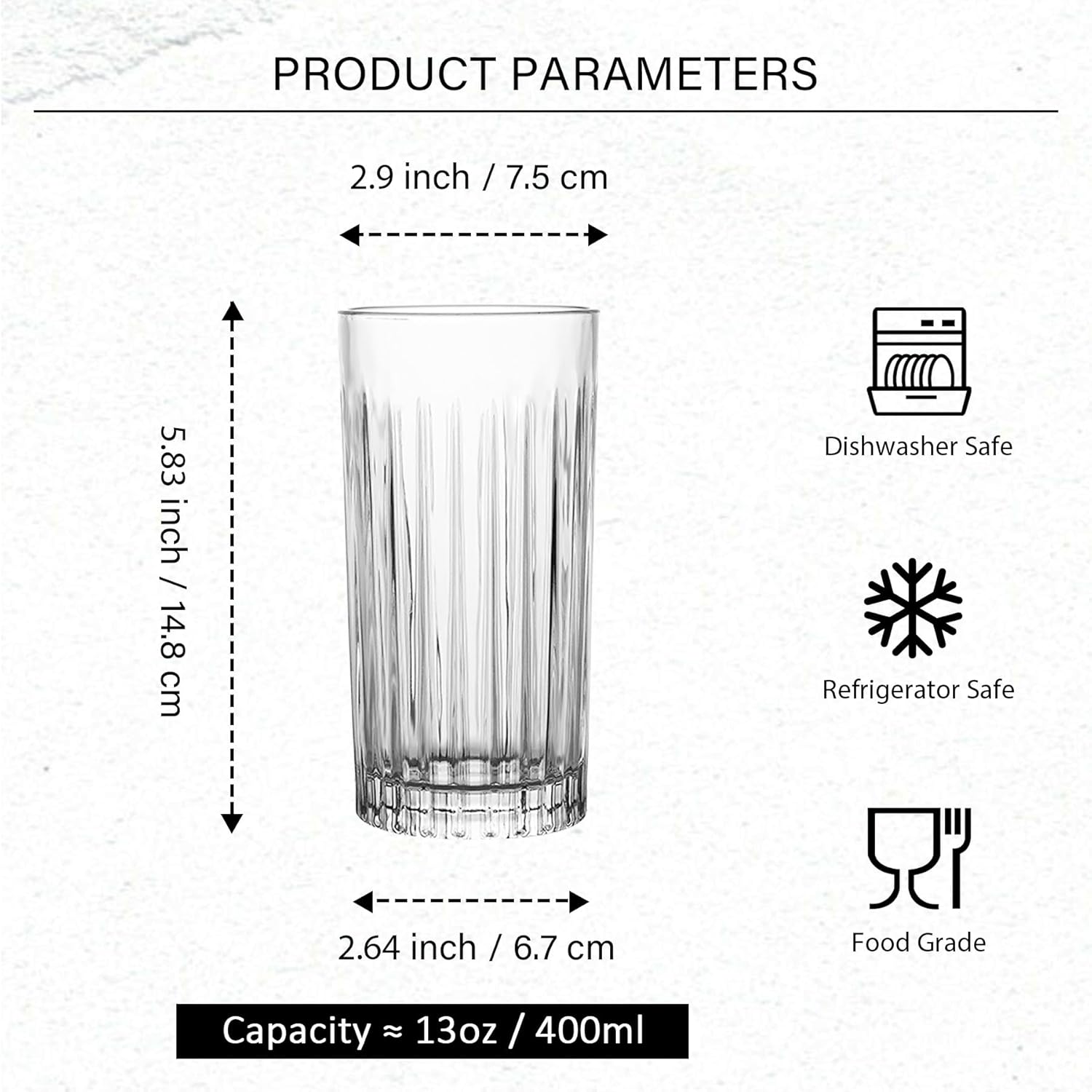 • Elegant Design: The sleek silhouette and clear stripe finish of our highball glasses add a touch of sophistication to any table setting, elevating your drink presentation for guests.