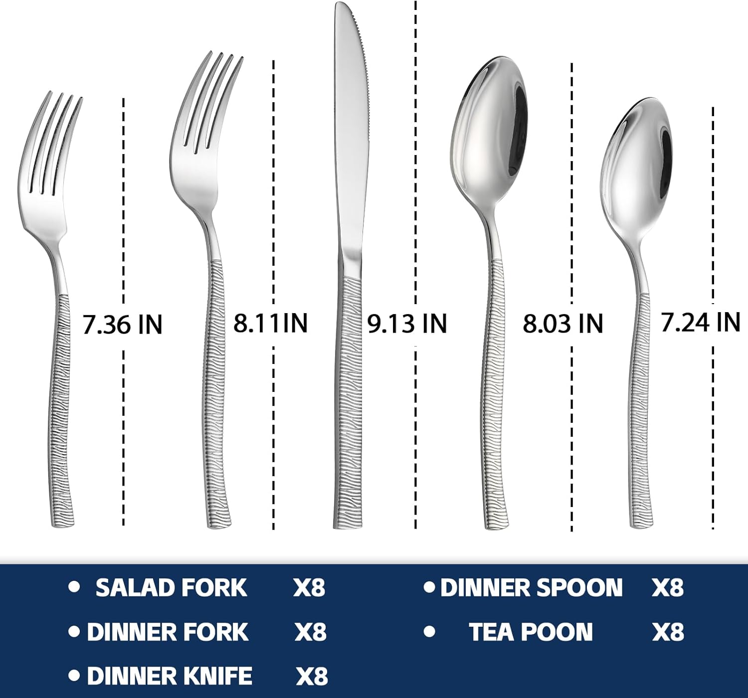 • 40-piece Silverware Set:This set includes 8 dinner knives,8 dinner forks,8 dinner spoons,8 salad forks and 8 teaspoons. The silverware set serves for 8 and is perfect for daily use.