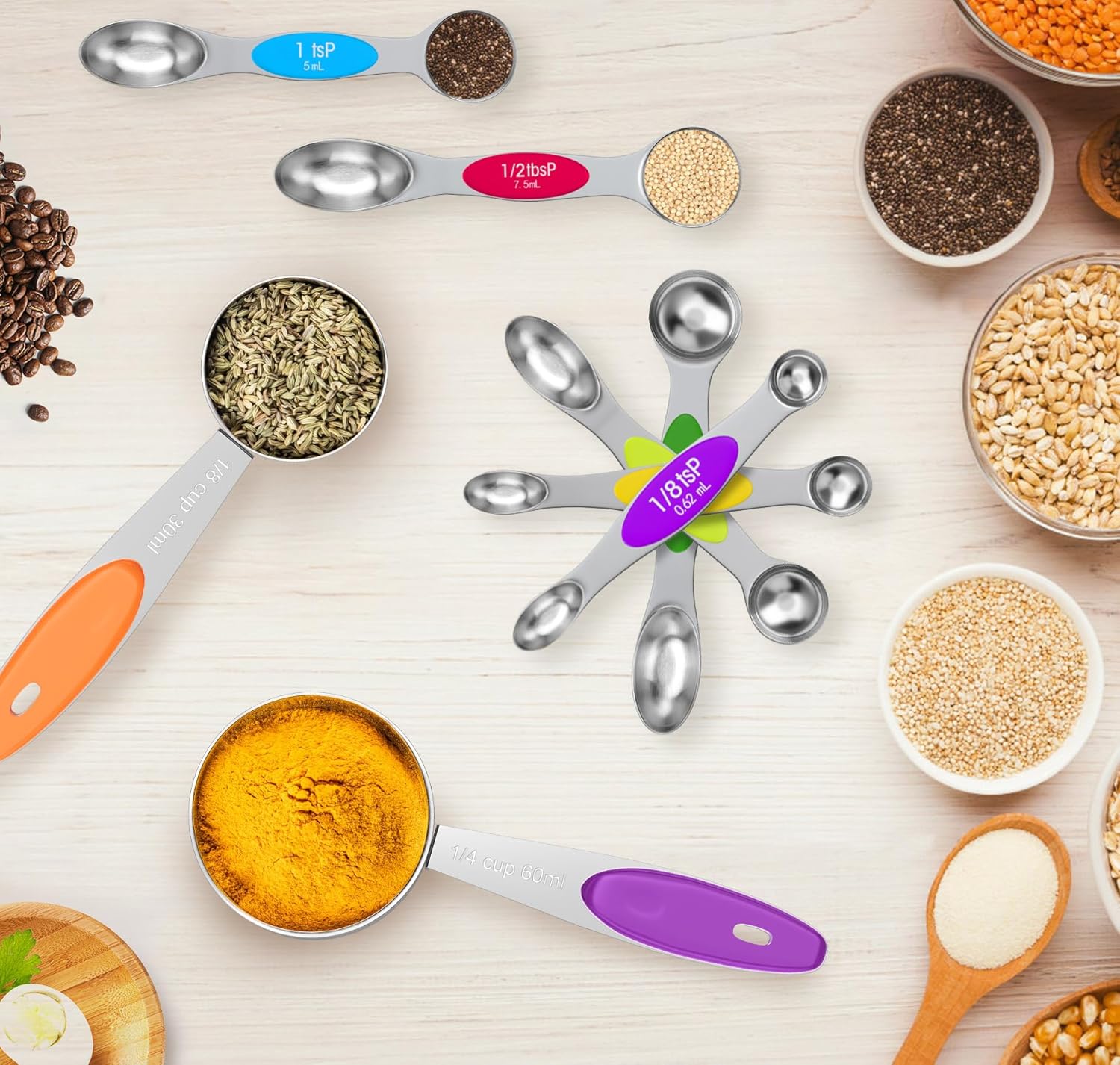 • 【Easy-to-Read & Accurate】Each cup and spoon features clear markings that will not fade over time. Double-sided spoons allow you to measure both dry and liquid ingredients, and the narrow end fits into small spice jars to reduce mess and waste.