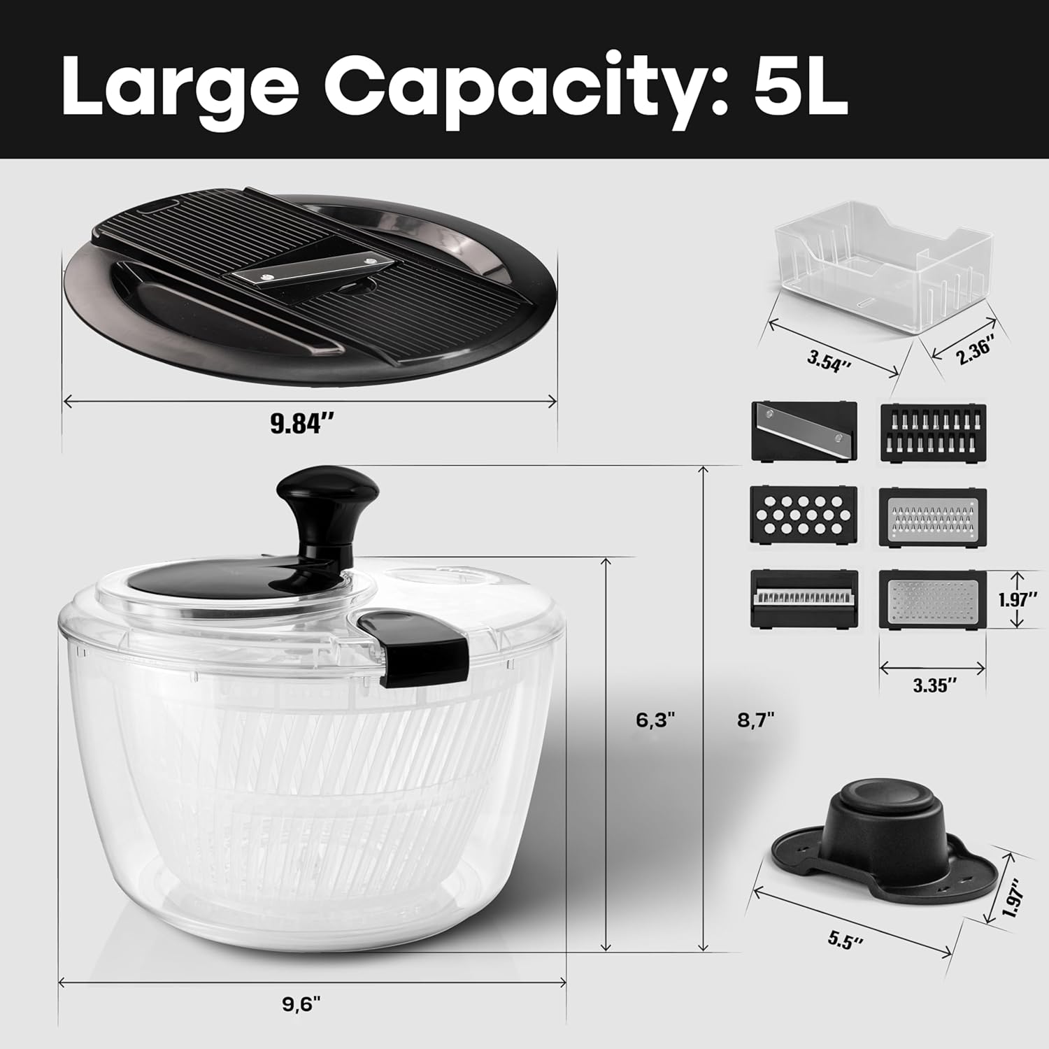 • [All-in-One Salad Chef Set for Healthy Living]Upgrade your kitchen with this complete 6-in-1 set! It includes a 5L salad spinner and a versatile mandoline slicer, empowering you to create fresh, healthy meals in minutes. Perfect for home cooks who value efficiency and nutrition.