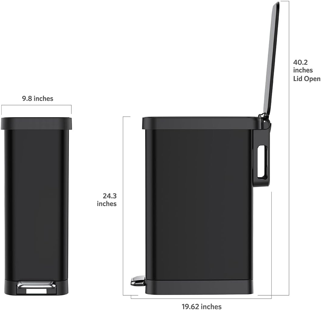 • STEP TRASH CAN WITH SOFT CLOSE LID: Lidded kitchen trash can is built with an easy step foot pedal for hands-free use. Garbage can lid is specially designed for a quiet, controlled open and close every time.