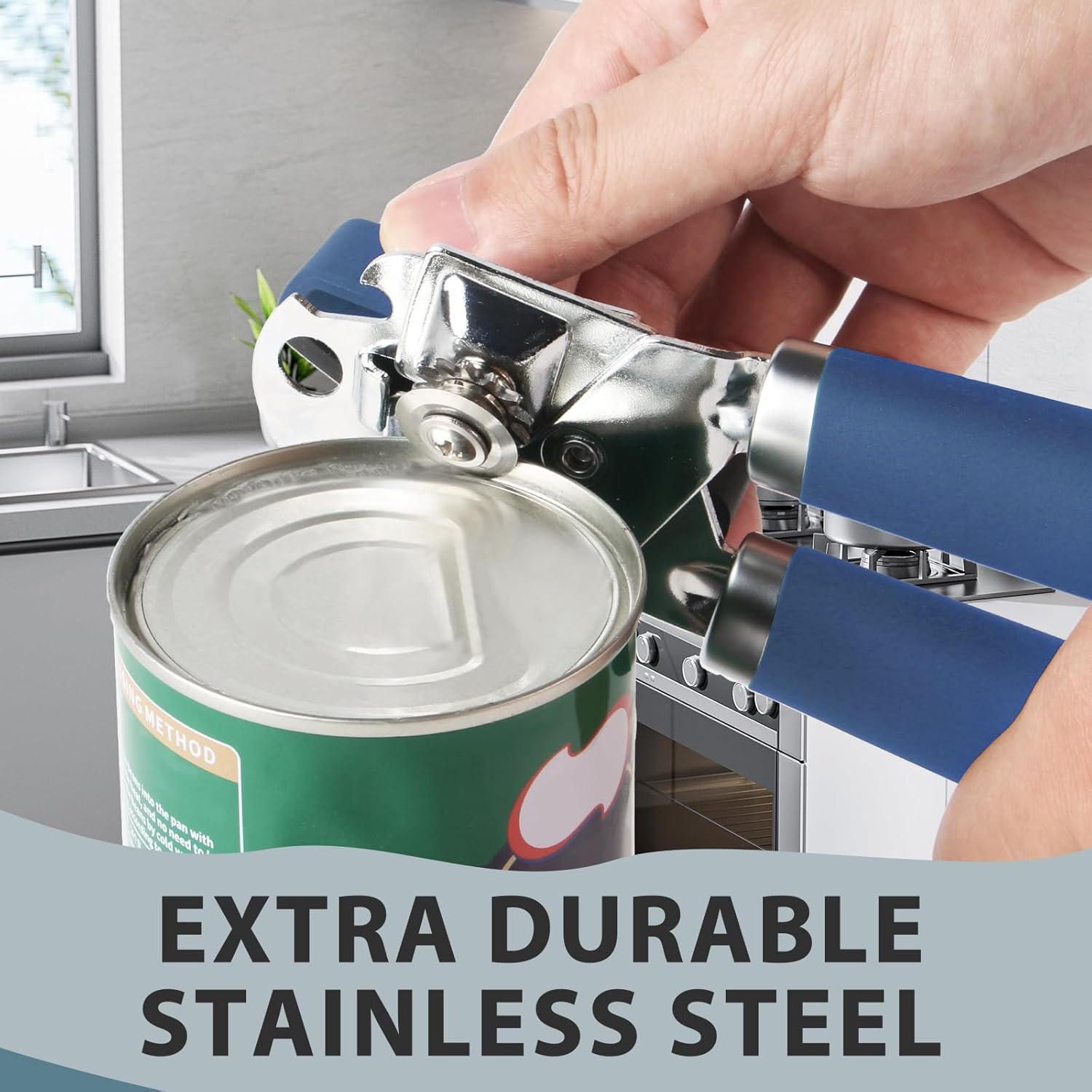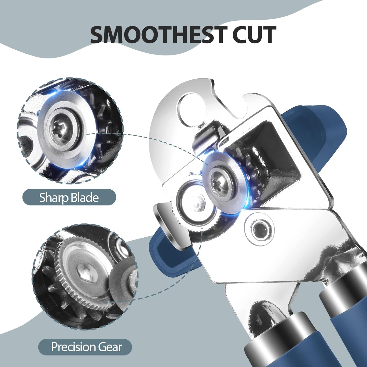 Can Opener Manual, Heavy Duty Handheld Strong Can Opener with Soft Touch Handle, Sharp Blade Smooth Edge, Can Openers with Multifunctional Bottle Opener, Blue