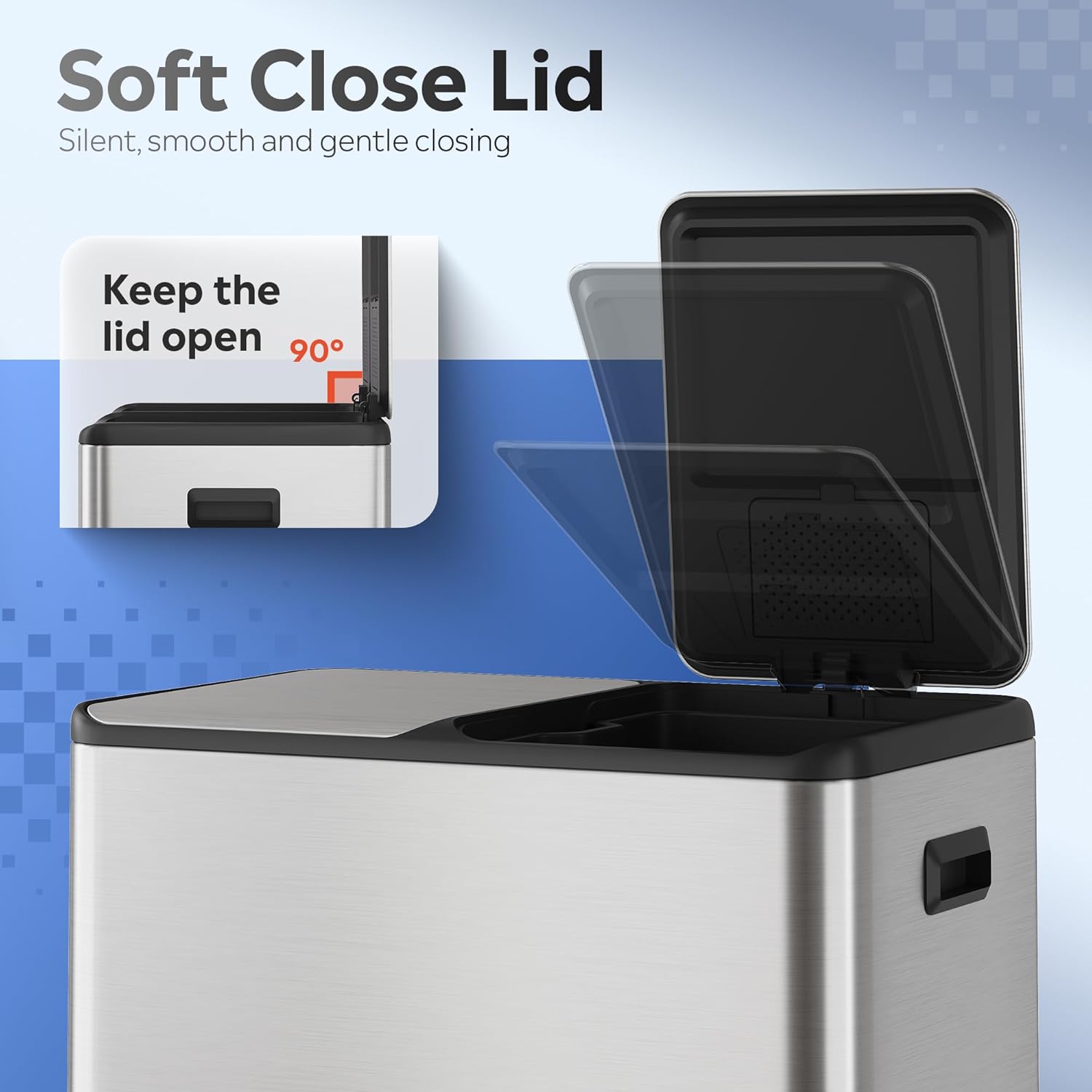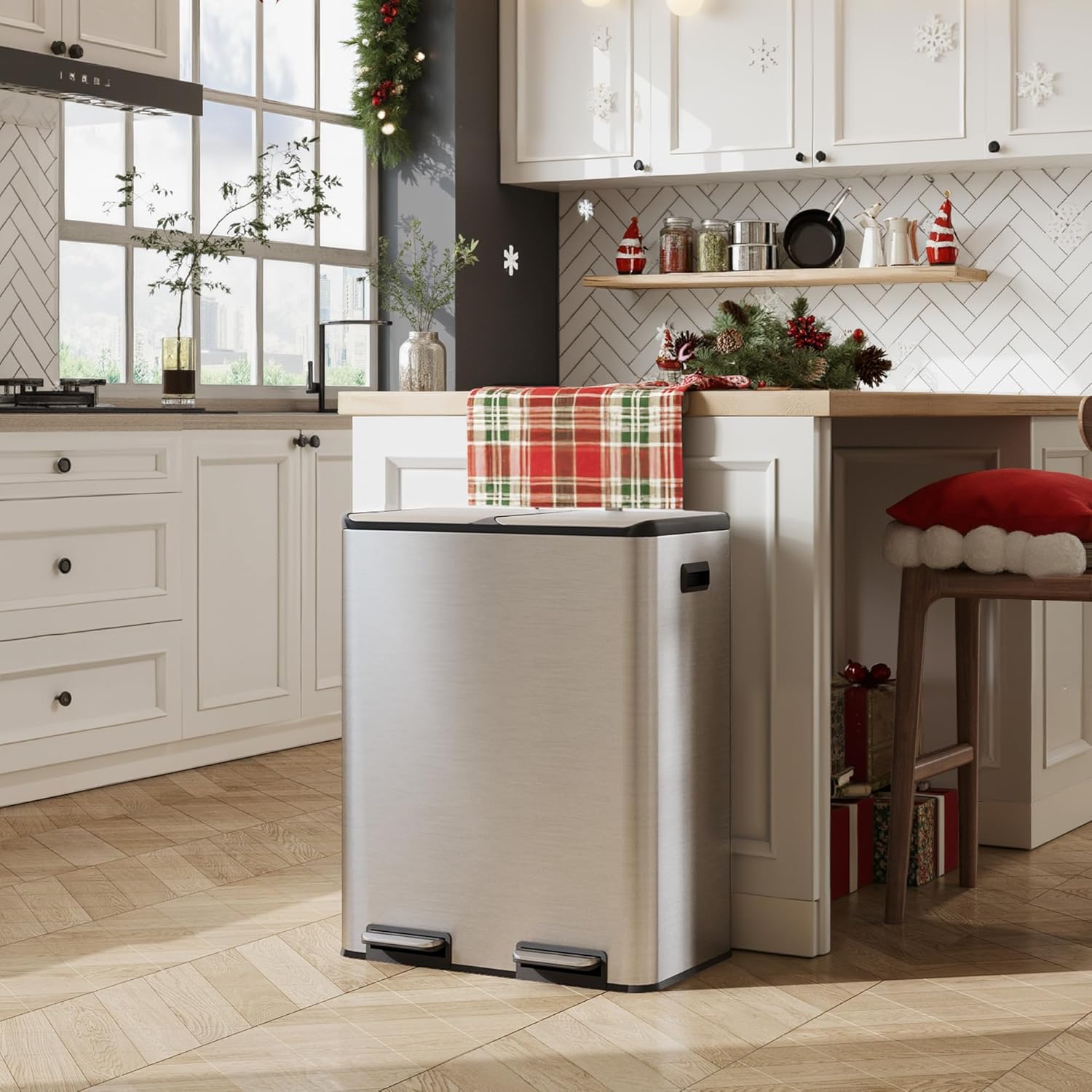 • 【Dual Compartment Trash Can for Smart Sorting】This kitchen trash can features two separate 8-gallon (30L) removable inner buckets made of durable ABS, with fixed slots and sorting stickers for easy distinction between trash and recyclables. Ideal as a recycle bins for kitchen, it supports efficient waste management without clutter—perfect for sorting dry waste, kitchen scraps, or recyclables. Note: For best fit, use 27"+ length or 12+ gallon trash bags.