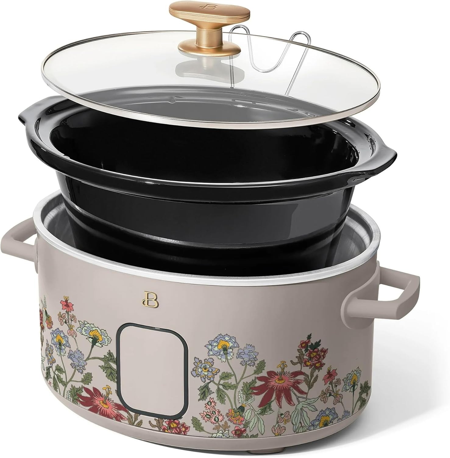 Beautiful 6 Qt Programmable Slow Cooker by Drew Barrymore - 5 Preset Cooking Functions, Digital Countdown Timer, Dishwasher-Safe Parts, and Cool-Touch Handles (Wildflower Porcini Taupe.)