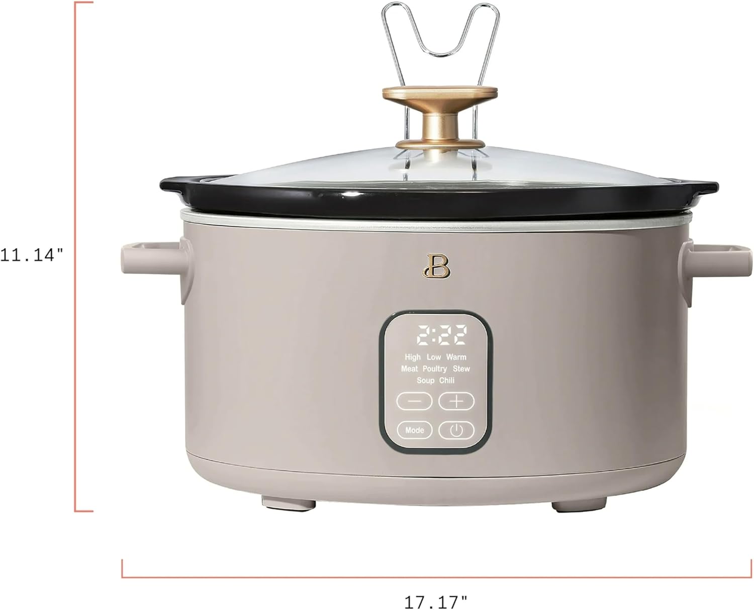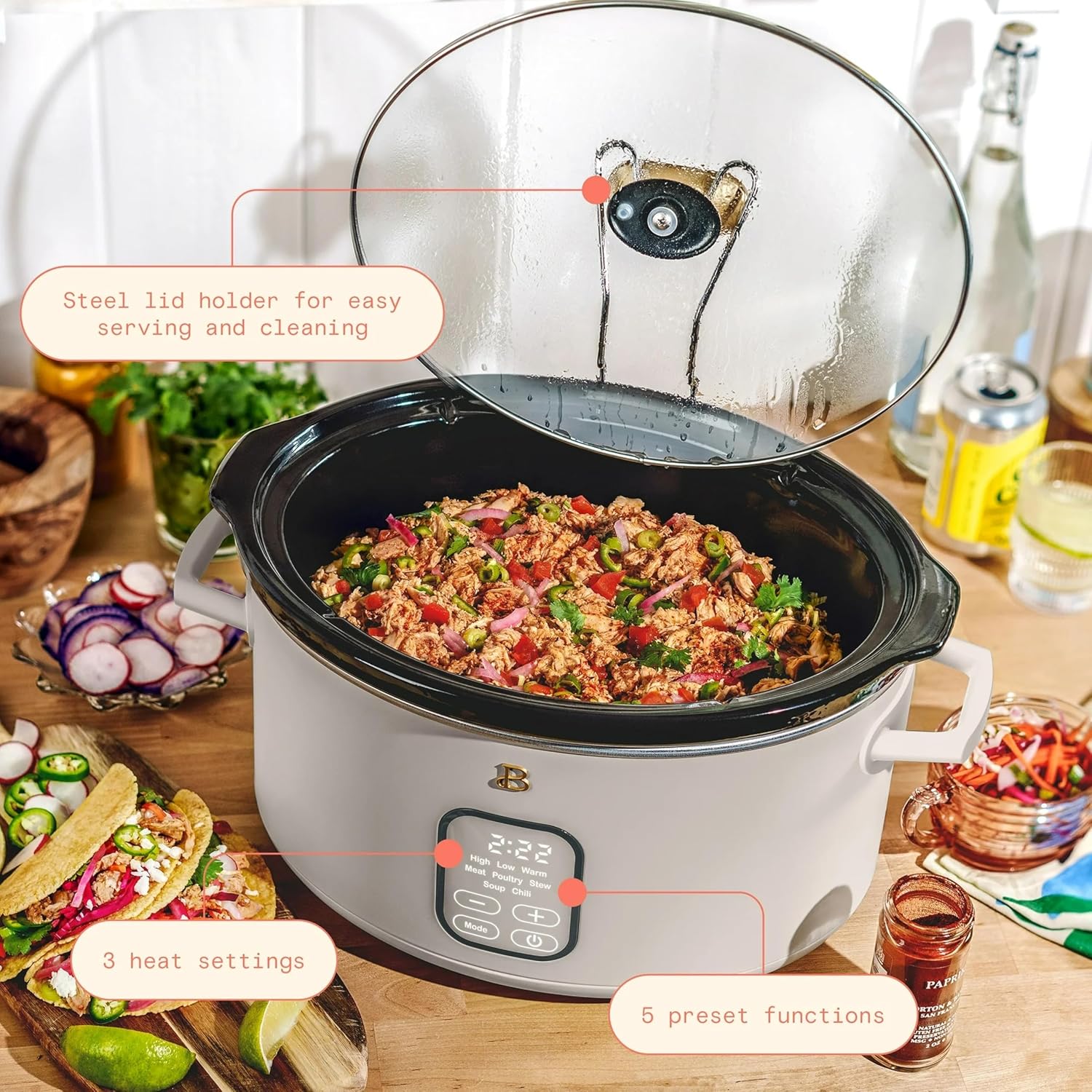 Beautiful 6 Qt Programmable Slow Cooker by Drew Barrymore - 5 Preset Cooking Functions, Digital Countdown Timer, Dishwasher-Safe Parts, and Cool-Touch Handles (Porcini Taupe.)