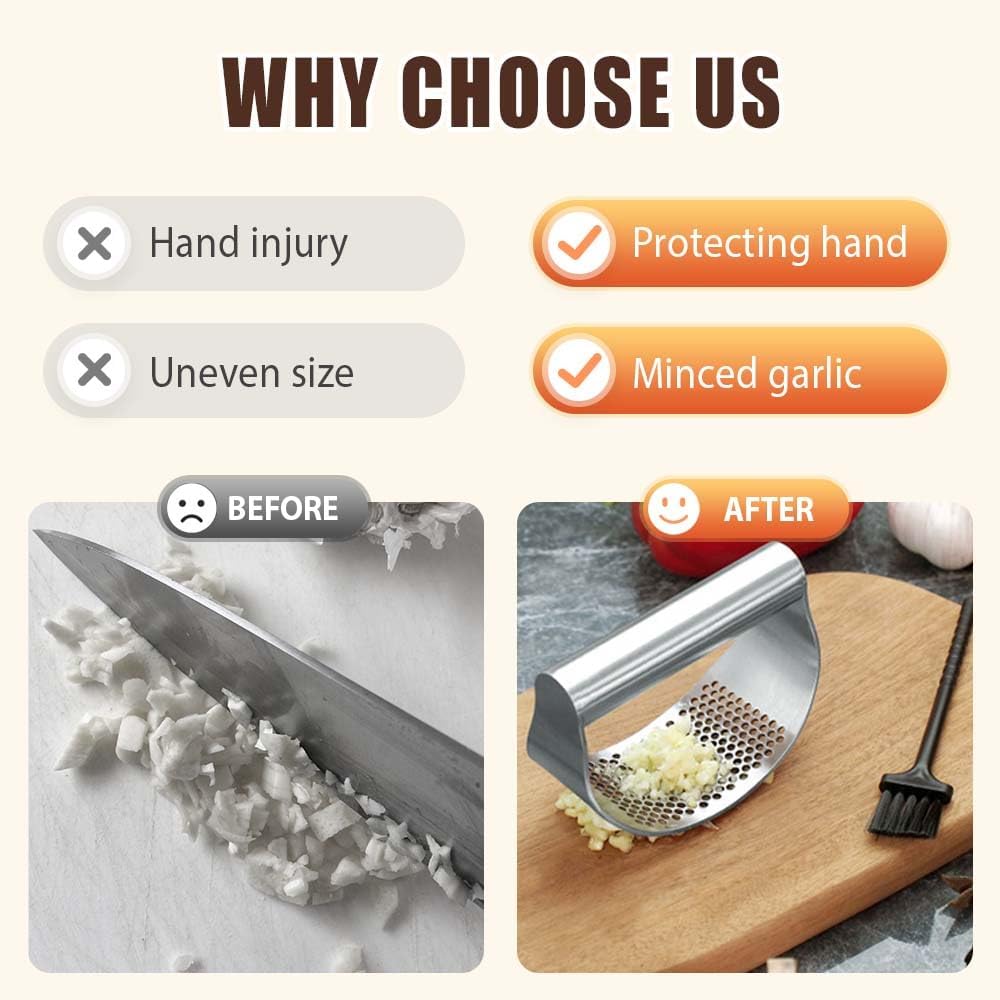 • Stainless Steel Garlic Presser: Crafted from high-quality, rust-resistant stainless steel, this garlic press is built to last.It ensures long-term reliability and consistent performance in your kitchen.