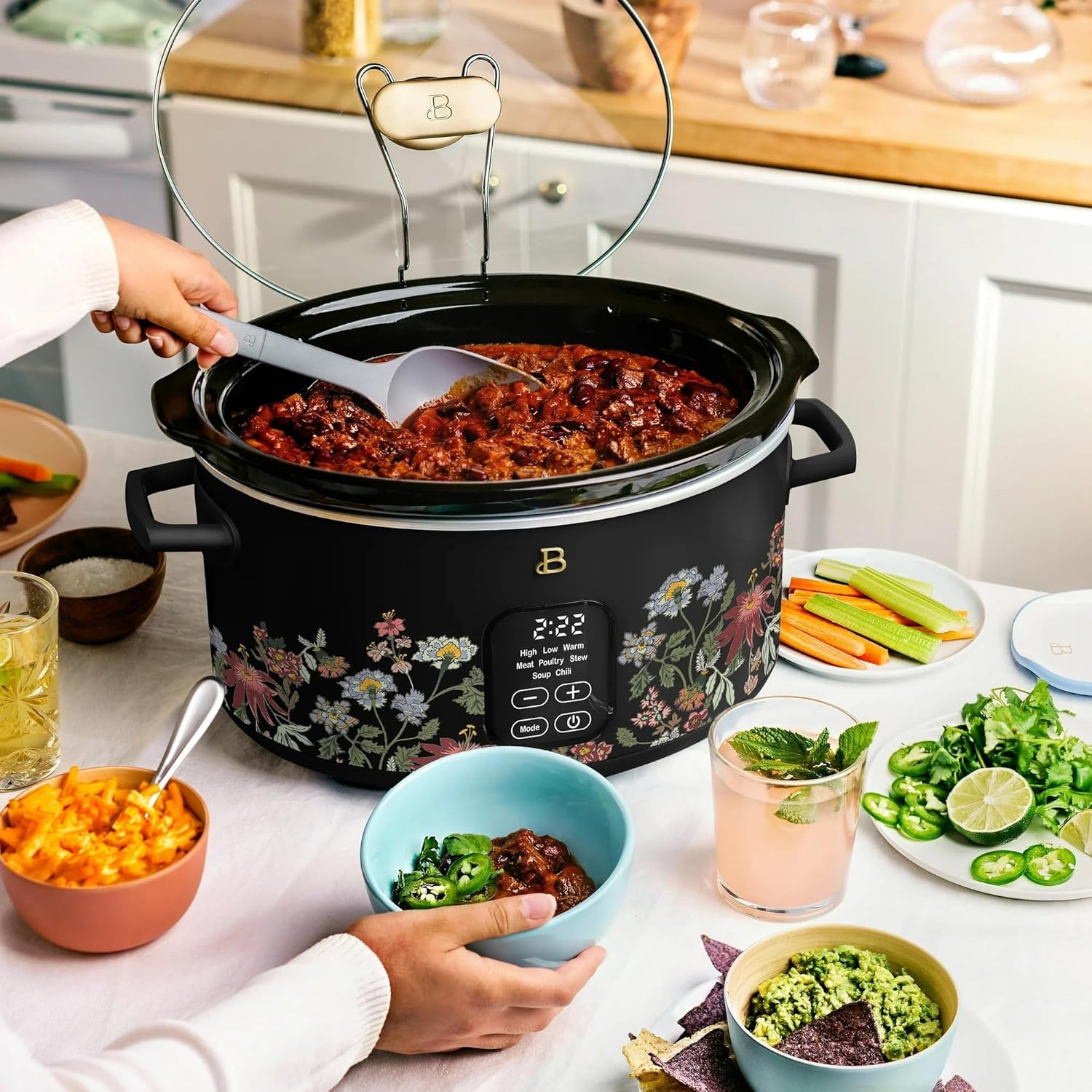 Beautiful 6 Qt Programmable Slow Cooker by Drew Barrymore - 5 Preset Cooking Functions, Digital Countdown Timer, Dishwasher-Safe Parts, and Cool-Touch Handles (Black) (Wildflower Black)